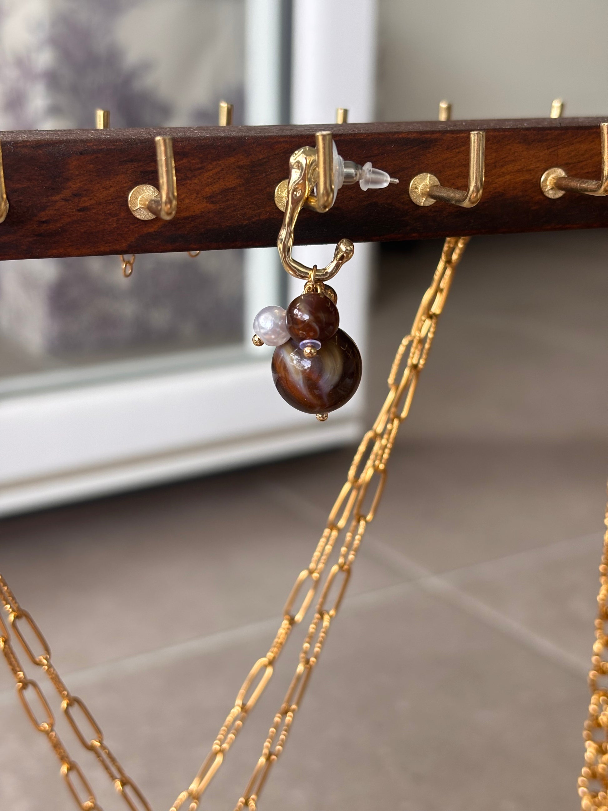 Les boucles Clara allient douceur et caractère. Leurs perles brunes aux reflets dorés capturent la lumière à chaque mouvement, tandis que leur monture dorée texturée apporte une touche d'élégance moderne. Une création à la fois intemporelle et pleine de personnalité, qui sublime toutes les incarnations et se porte aussi bien au quotidien qu'en soirée.