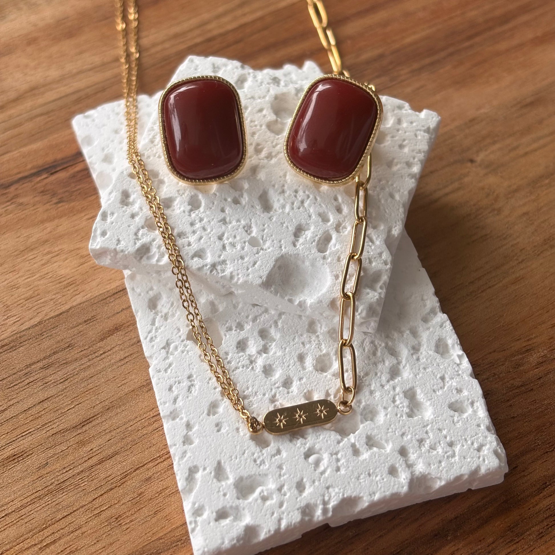 Les boucles Eléonore allient intensité et sophistication. Leur teinte rouge bordeaux associée à l'or reflète une allure affirmée et chic, idéale pour sublimer une tenue de soirée ou rehausser un look quotidien. Ces boucles d'oreilles incarnent la féminité audacieuse et intemporelle.
